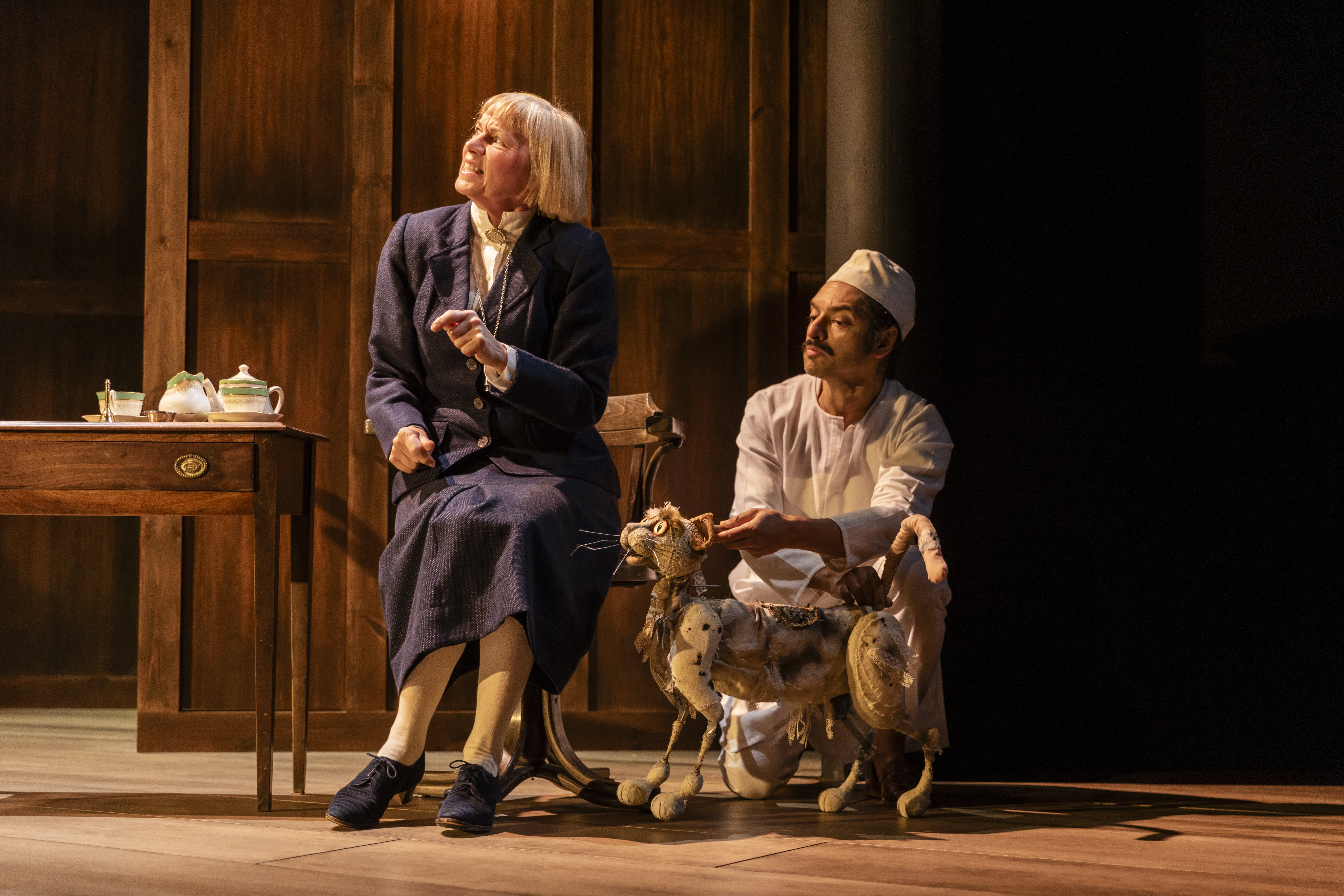 For a production like A Little Princess, I have to prepare the puppets enough but not have the final thing to allow for developments in design and stage action. There are some lovely photos of Malcolm (the cat) that were taken during rehearsals, a very skinny looking animal, but I like to get to that point as soon as possible so the actors can get used to performing with it. Then the real skill is when you start to ‘dress it’ , that you don’t mess up the mechanisms and try to preserve all that movement. Fabric really can restrict a puppet. Malcolm’s looking really good now, he looks great on stage, he’s a mixture of broken down fabric but also very bold shapes and colours. The use of lace is really nice, it looks as though has a bit of a wobbly belly and matted tufts.